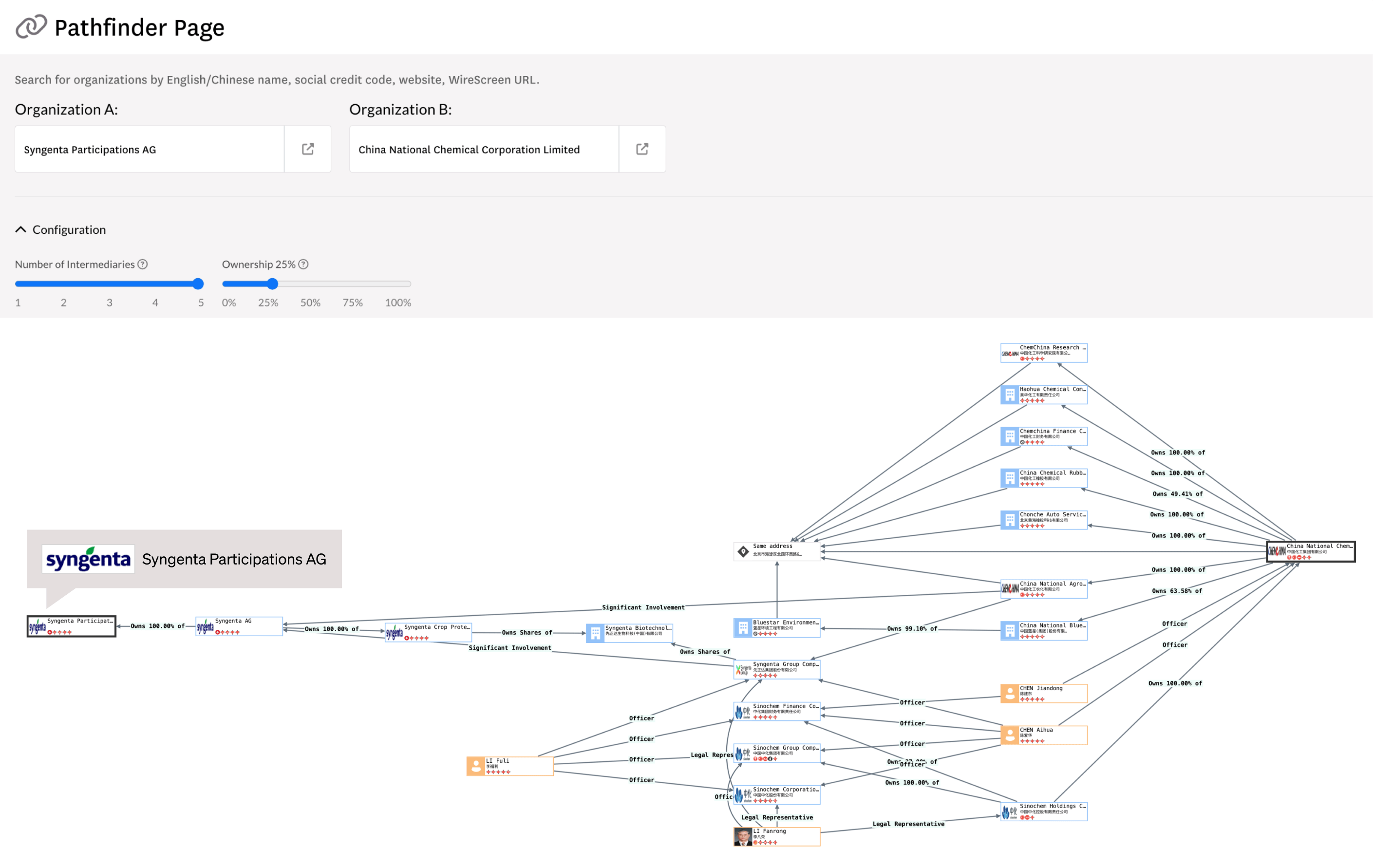 WireScreen’s Pathfinder immediately reveals these connections by entering the company name at each side of the node.